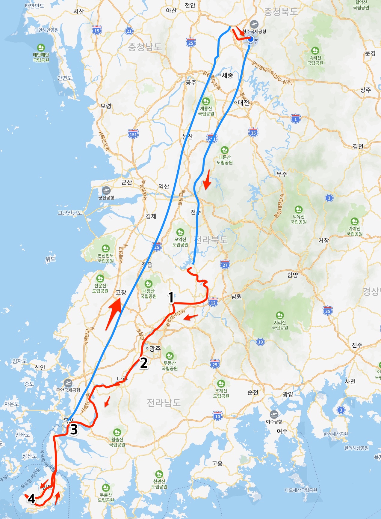 청주-(버스)전주-강진면-유등삼거리-담양-죽산보-느러지-목포-진도-목포-(호남선 기차)조치원-미호천길-청주